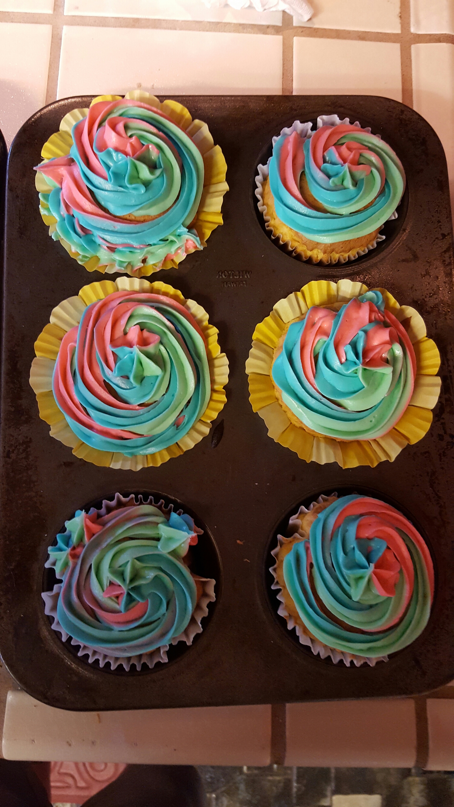 While doing laundry I decided to make a desert for family dinner. I chose cupcakes because we wanted to try out this new frosting bag. It takes 3 different colors and swirls them together. It took a while to get them all attached, but I think they ended up looking alright.