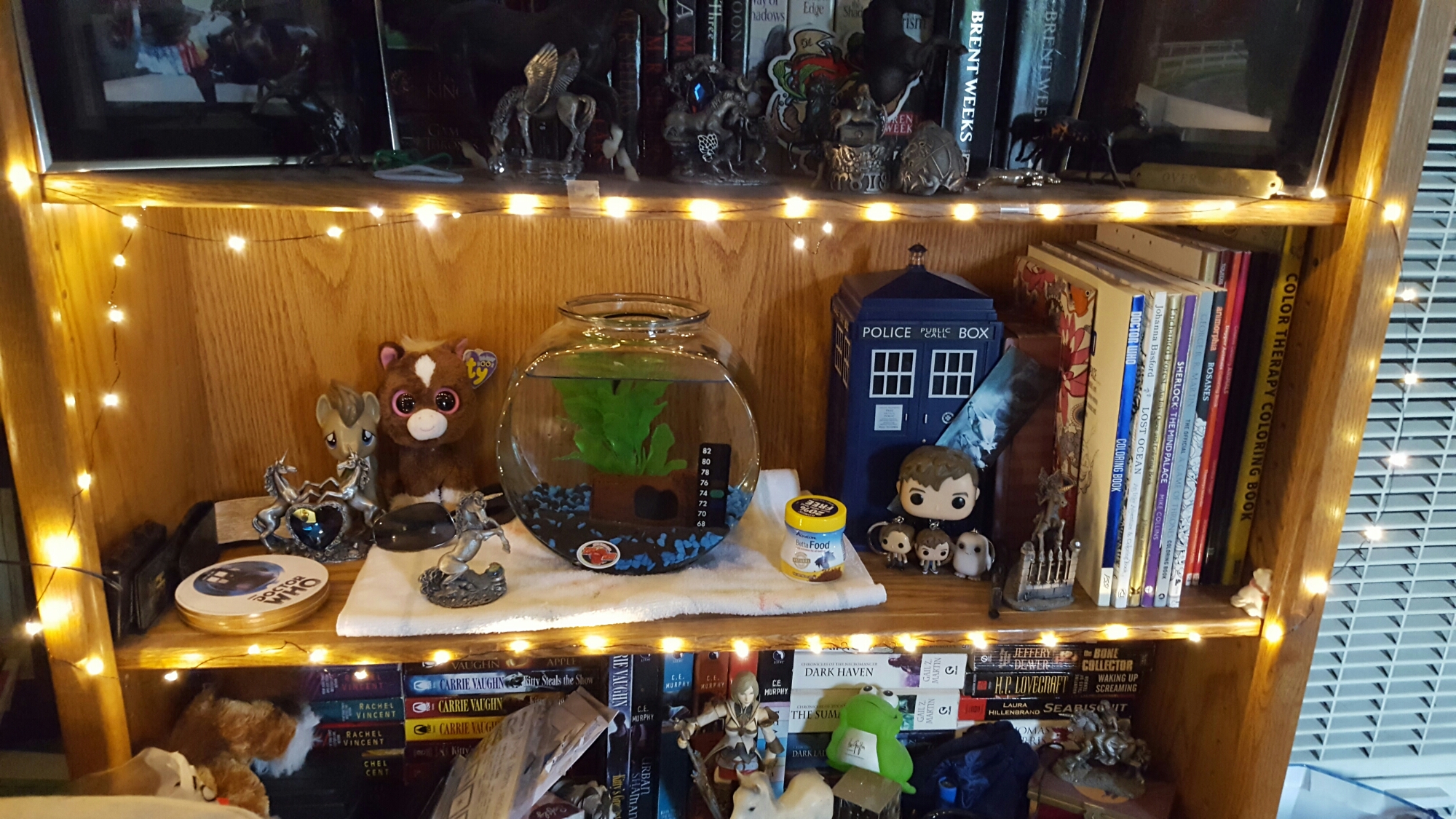 We decided on where Stormfly should live. He’s on one of my bookshelves in the living room so we can see him most of the day. I wrapped lights around the shelf to give him some extra light and then put some of my nicknacks around him. He seems to be okay now.