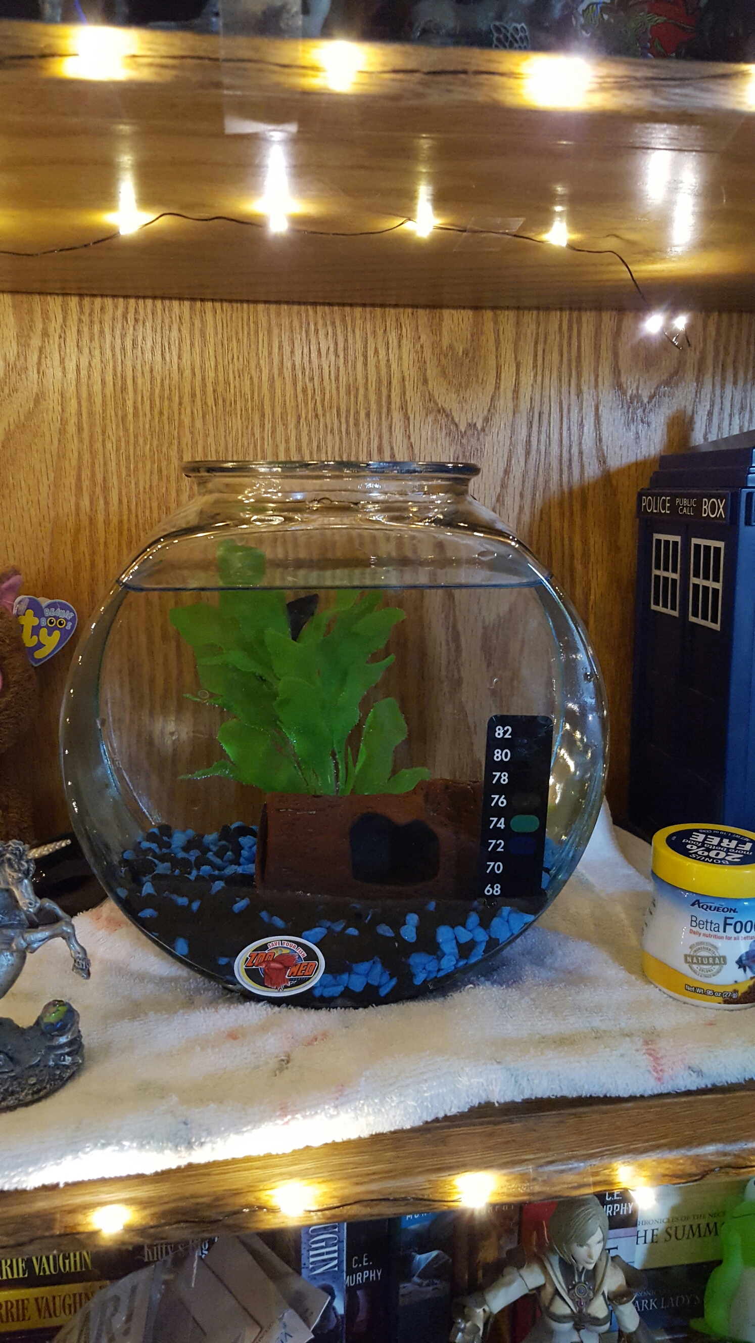 Well, we kept walking around browsing the other fish. Seeing which ones would get along together and how much stuff would cost. Trying to figure out what size would work where we want it and how much it would weigh. But I still kept going to back to the beta fish. I even asked my boyfriend to help me leave so that we didnt buy a fish today, but he hesitated and so now we have a fishy. I’m super happy with the fishy. We bought him a bowl, rocks, a log he could hide in, some fake seaweed and a little heater for just in case. We want a happy and healthy fish.