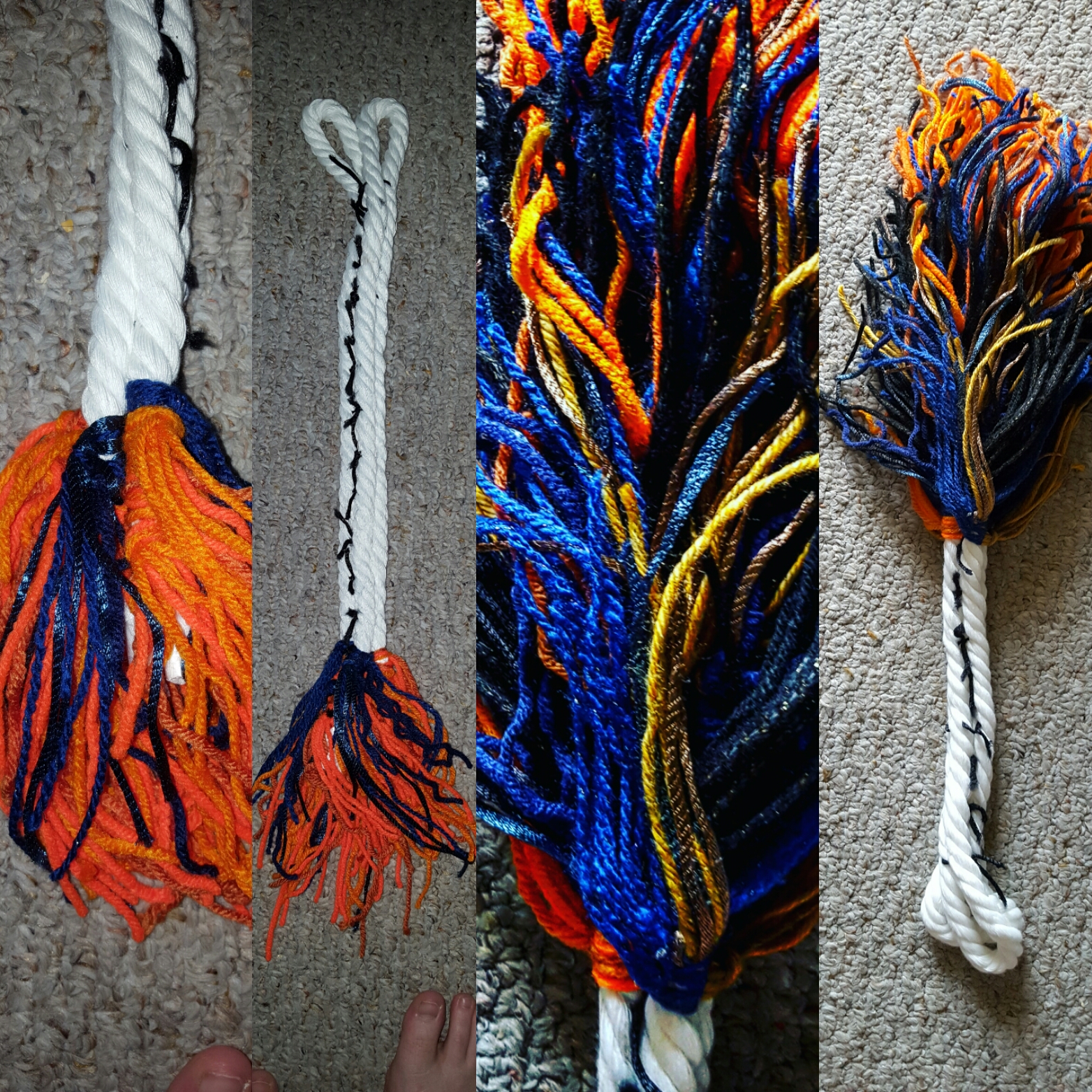 So last night after the zoo I went to my local craft store to get some more cording to make some tails over the next few days. The first tail that I am working on is my space tail. It’s a mix of blues, browns, blacks, and oranges. I decided to make the cording a little shorter this time around, so that its more like a cat’s tail instead of a horse. Just one length of hair the whole way up. (Ignore my toes)