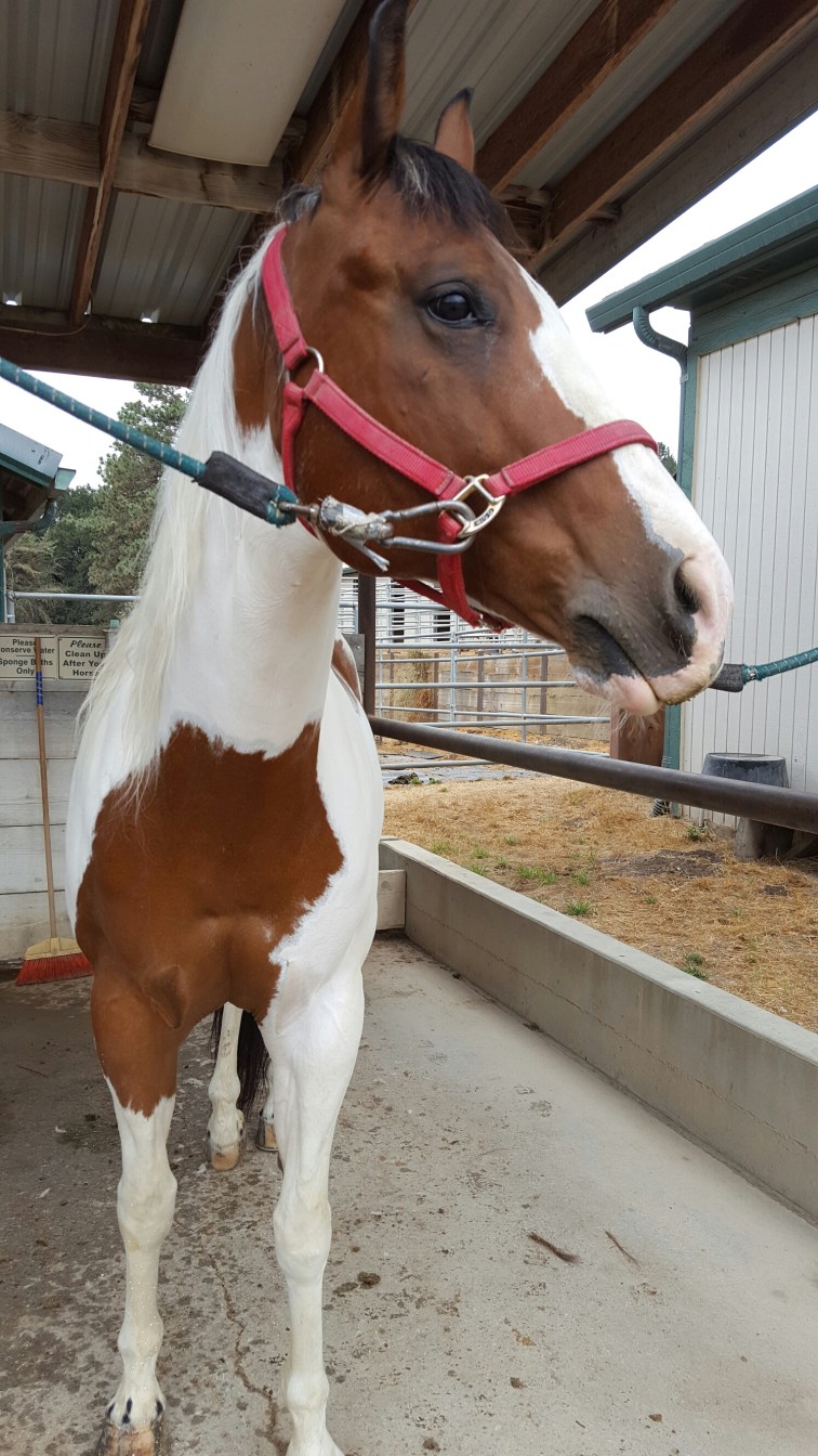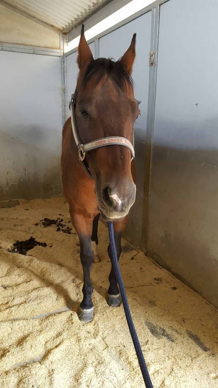 We switched things up a bit and I got Sherman out next. He was nice and quiet as I groomed him, but he is shedding like no one’s business. White hair everywhere. So I talked him up and went to go lunge him. I had him already to work, was just about to put my gloves on the lunge him and zoom! Off he goes; ripping the lunge line from my hands. So he canters around the arena, galloping and bucking with squeals and farts. I try to catch him and after 5 minutes of him eluding capture my boss comes in the arena to help me catch him.