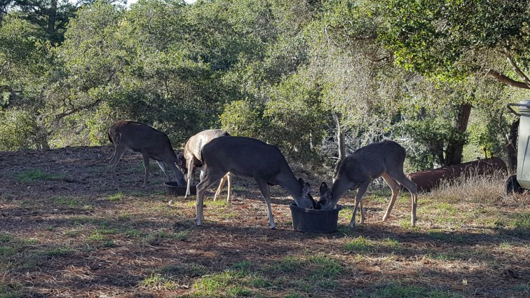 I went back over to feed him dinner and saw that he hadn’t really eaten through the day. I decided to call the vet and wanted to ask him questions. I explained what was going on and how he wasn’t eating, and the receptionist said to take his temperature and shed have the vet call me back. 2 hours later and I’m still waiting for the call. But he doesn’t have a fever. Sitting at 99.7°. And we did get him. To eat something, which is good. As I was hanging out with Gucci in his stall some deer came up next to us and started to eat. I managed to be sneaky and get some photos.