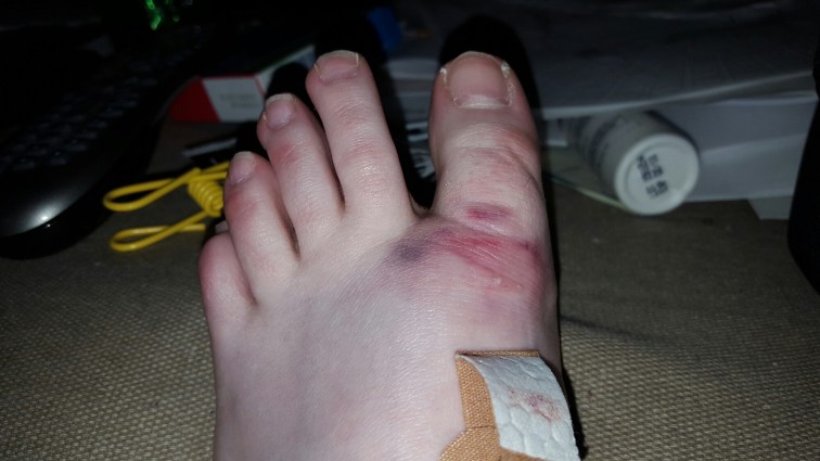 So this morning I was looking for my feast boots to wear with my dress at Darkshore XX. It finally clicked that they were in my amtgard bag. So I go and pull my bag put of the closet and one of the table leaves decided to jump out and attack me. It landed on my foot. Lots of hours later its bruised and I might have broken something. Take a look for yourself.