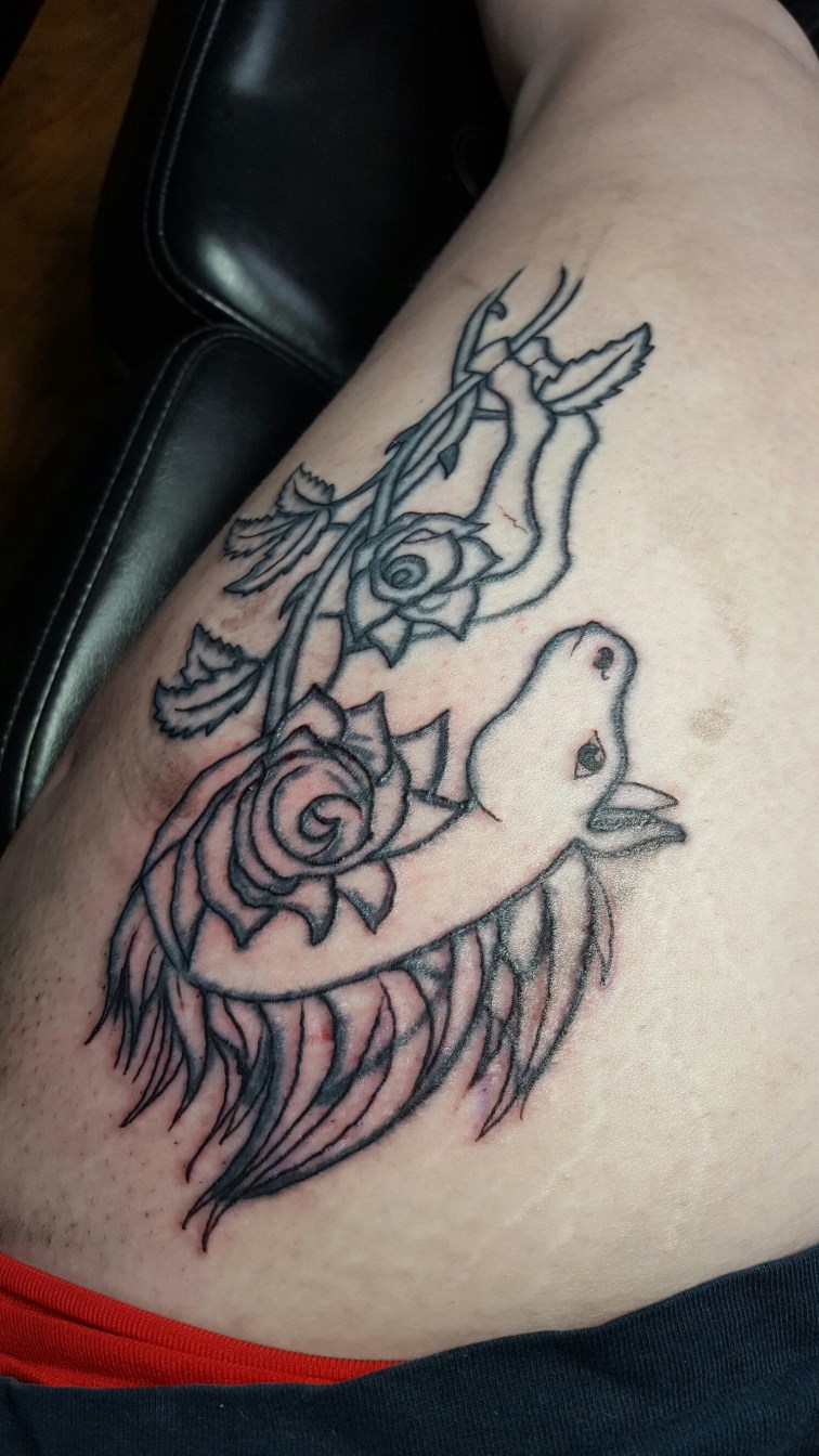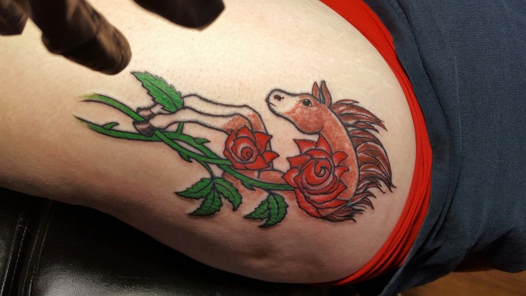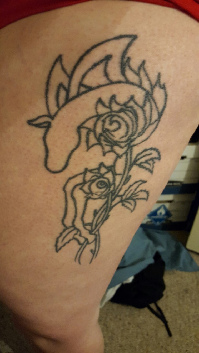 I get my outline that I’ve had for years finally colored in. I found an artist who is respectful of what was put there by my previous artist. The original artist retired and has since passed away, so getting it filled in by him is impossible. I went to the tattoo parlor that did my arm tattoo, but they didn’t/couldn’t come up with anyway to color it in. They were thinking of a cover up for it, which is sad.