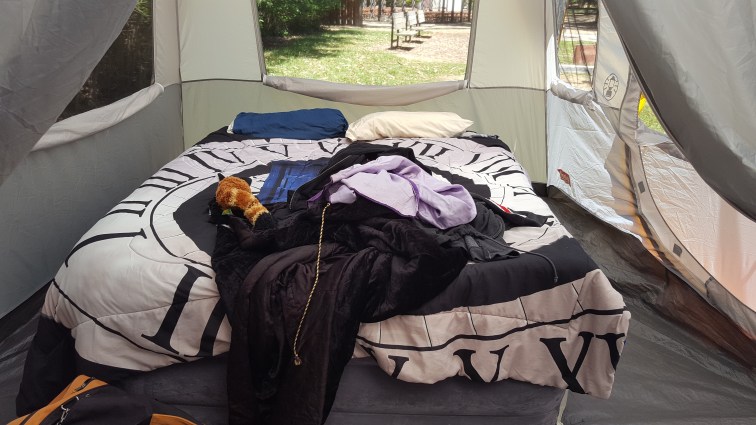 Not as long as the rig would be if we were using the F 350 but still it’s big for my little truck. I worked on getting stuff in our tent and settled. Have you been inside our tent before? It’s tall enough for Fiks to stand up in and it’s got 2 rooms. I love our tent and our blow up bed.