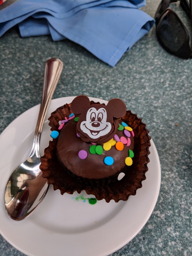 We waddled around for a bit and went on Big Thunder railroad. Then we went for lunch at the River Bell Terrace. It was really good, and they even had an allergy menu which was nice. I ended up getting chicken. Fiks got a pork slider. And we got an happy engagement cupcake.