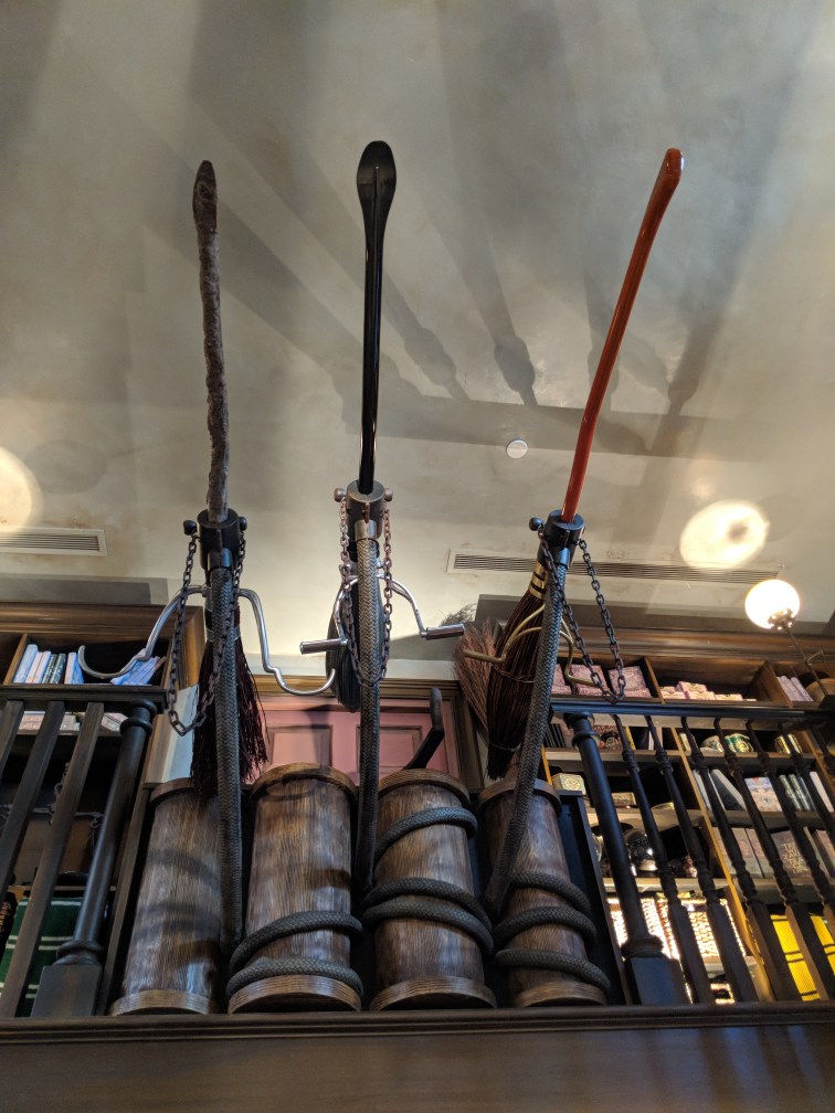 The ride was fantastic. Definitely recommend. There were so many people walking around in wizards robes. So cool. I’m such a nerd. I think I’ll have bought a Harry Potter shirt by the end of the day. The question is which one. We went into Olivanders for a wand selection. It was cool to watch. I even tried on wizard robes, but I couldn’t afford them sadly. I would have blown my whole budget for the day on them. Oh well. But I did get a photo in them.