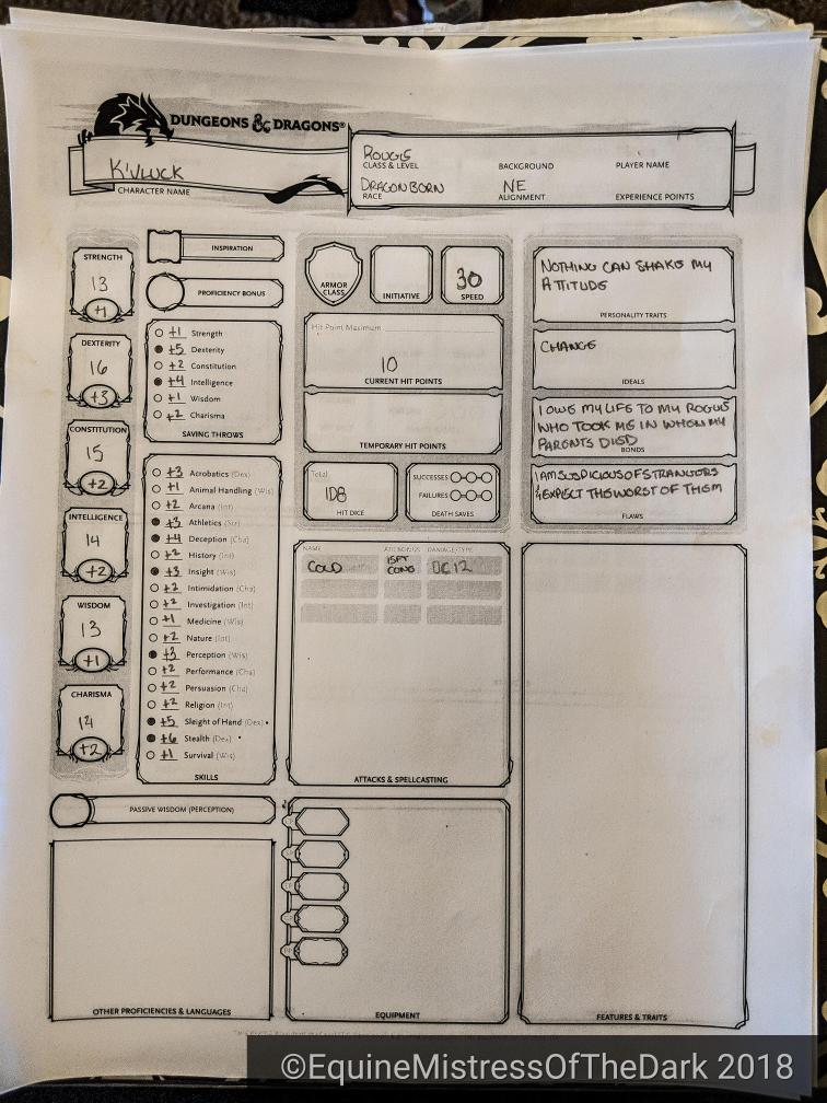 After I got off work I went home and got ready for gaming. We’re playing dungeons and dragons 5th edition. Meet my dragonborn Rouge, K’vluck.