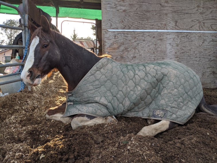 I went inside and asked how long he’d been down. No one knew he was down. I explained he wasn’t sick, just down. He did take a cookie and two carrots from me after all. So I made his medicine and poppa and I went out to paste him, and he was standing up in his stall. So that was some relief.