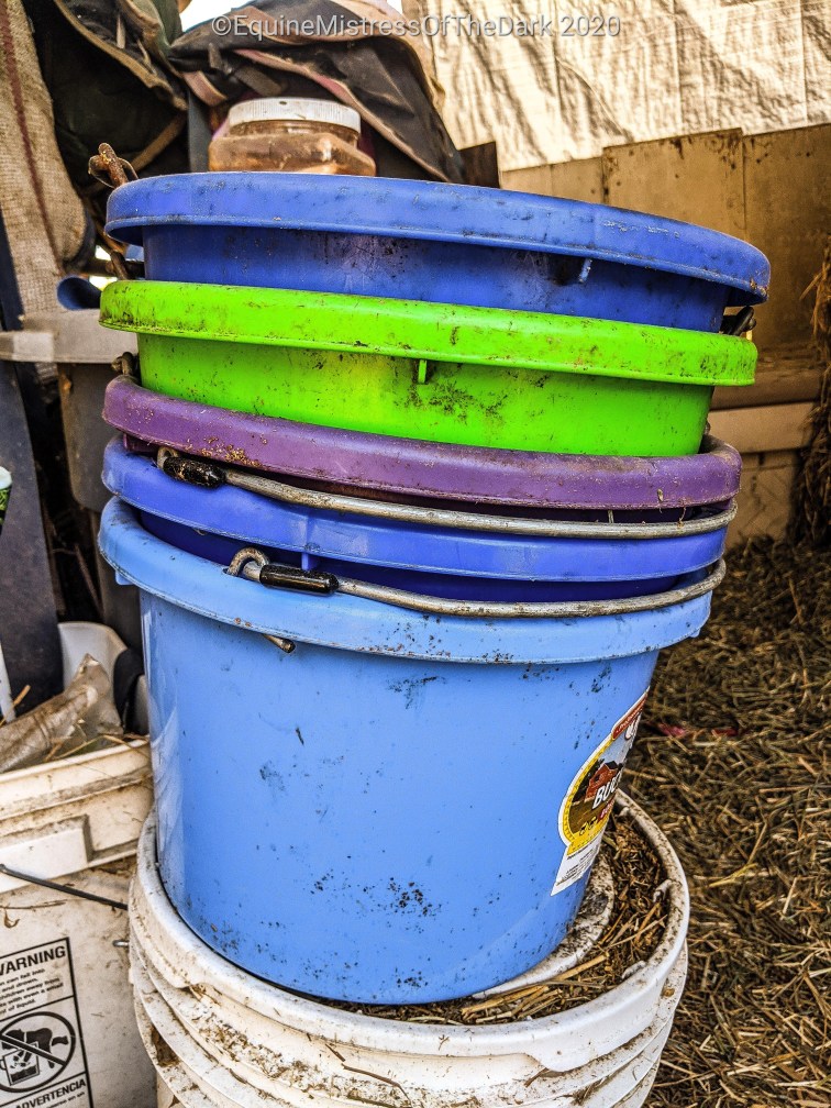 I saw his stack of buckets needed filled. Good thing that I remembered to go to the feed store because we almost killed the bag that was there. It would have got us until… Sunday morning if my math is right.