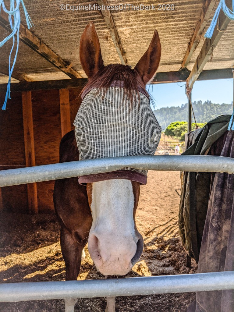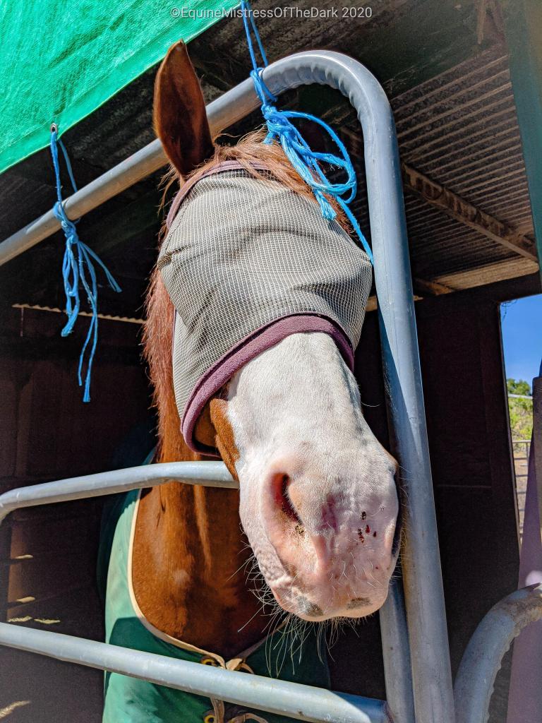 I fell back to sleep after my roll and I woke up after Futurama was done. So I turned on and watched some Disney+. After spending a while to wake up I got dressed and headed over to Gucci. Gucci still had his blanket on when I got there, so I took it off and put on his fly mask. Then I gave him a flake of hay, which he took a bite out of as soon as I walked through the door with it.
