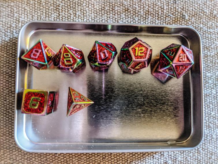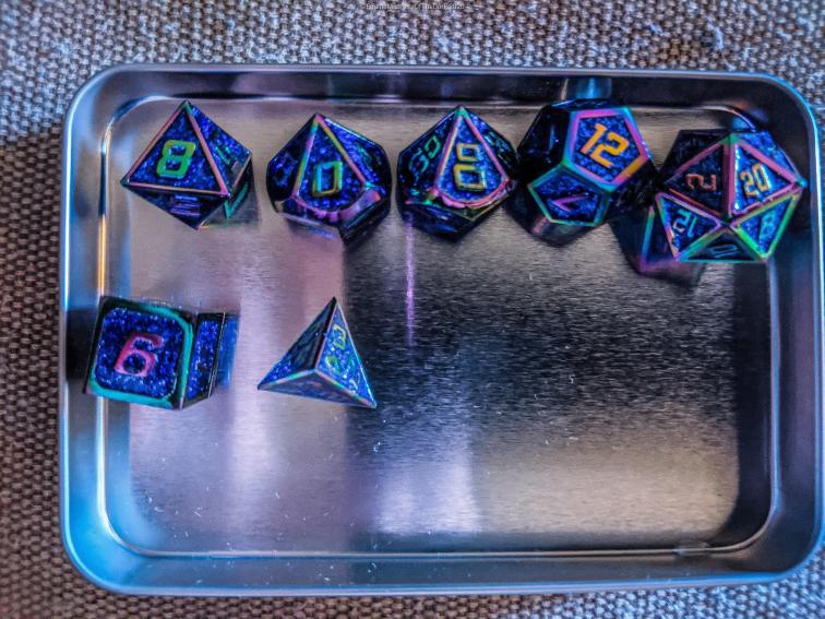 I came home and went to the mail box to pick up a box that had finally showed up 3 months late. But I got my dice! My Phoenix and my Unicorn dice. I took them out of their boxes and dunked them in some soapy water to clean them up a little bit and then went and got cleaned up. Afterwards I cleaned them up and put them in my dice tray.