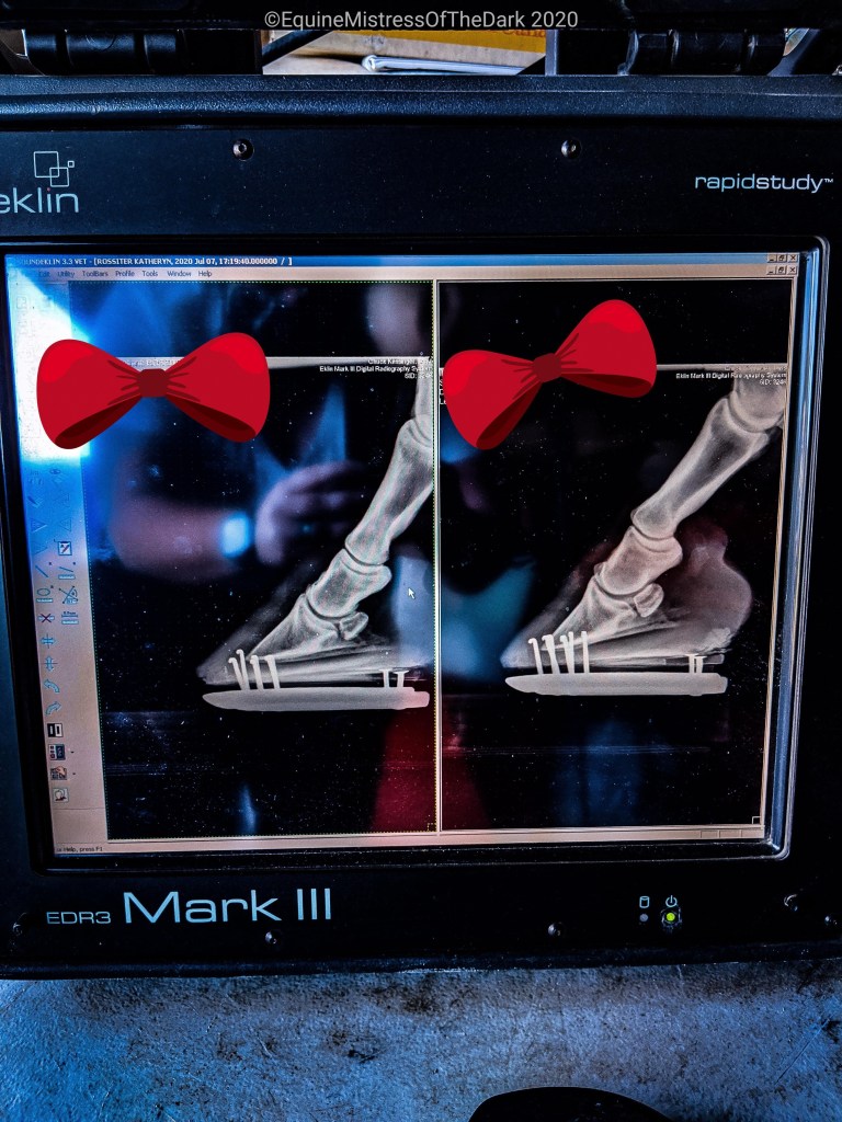 I ran inside and told Mom he was there and then I back Gucci up. I told him what’s been going on with giving him his medicine lately. So he looked in his mouth and and everything was fine. Nothing was painful or swollen when he looked inside. He said he was stumped. Next they set up the x-ray machine and the blocks for Gucci to stand on for said x-rays. They went pretty quick, and his feet look good. No rotation of the coffin bone and his nivicular isn’t any worse.