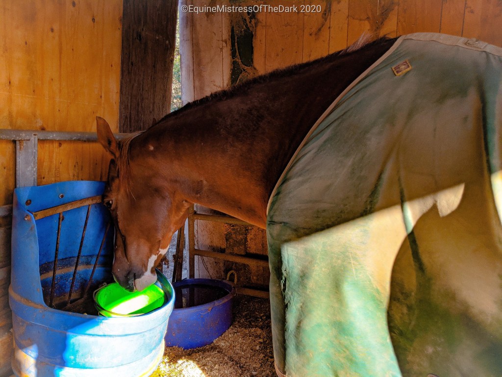 After dinner I made up Gucci’s medicine and Fiks went as my back up. He was good for pasting, so that was nice. I gave him his flake of hay and then I made up his buckets and asked Fiks to give him the first one I made. Well Gucci was giving attitude after being pasted and knocked his bucket over and then threw it on the ground while I was making his other ones. Then Fiks and I came home.