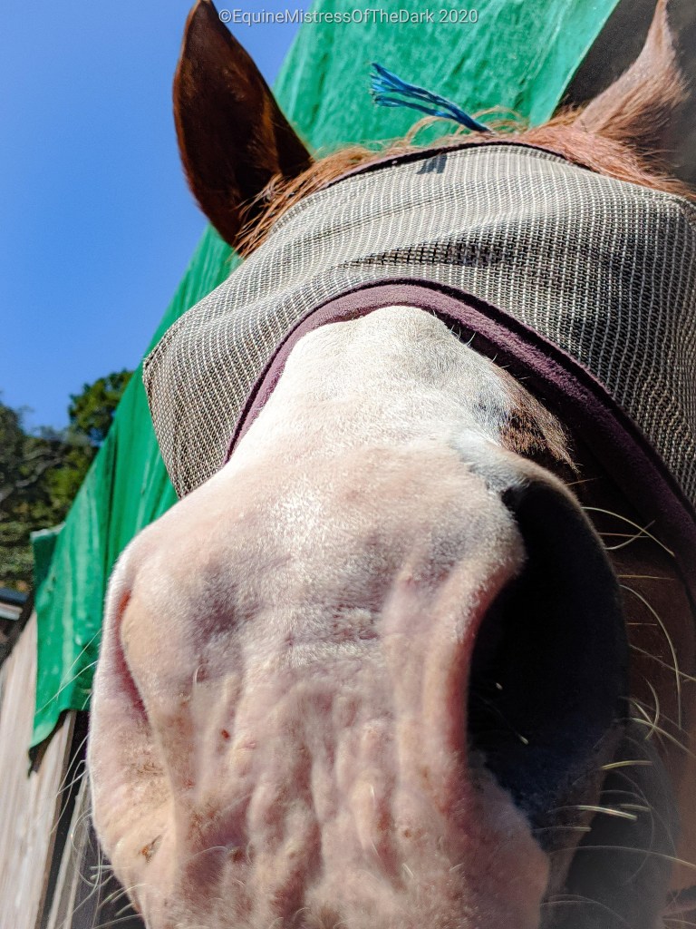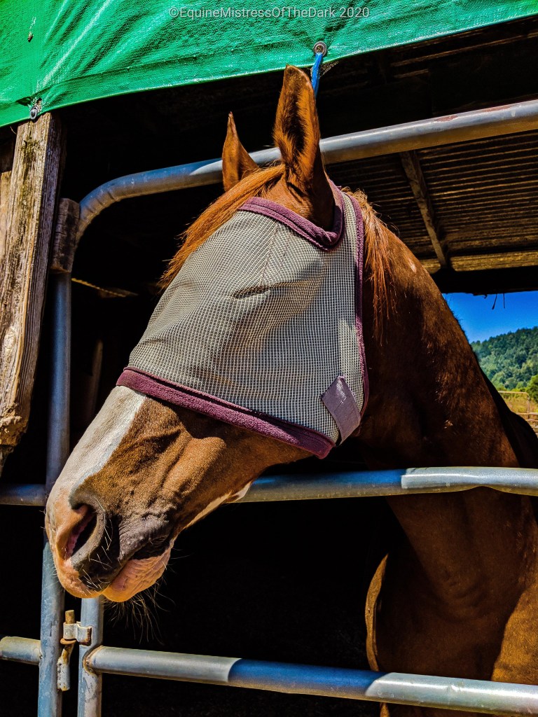I know its not Halloween yet, but it was just something fun and funny to do. Mom and I watched more Chopped while Poppa went out and worked the weeds. After a little while I went and got Gucci out and we went for his 3 laps and then we went in the field and visited Poppa and walked around the giant dirt/weed pile. We walked back to his stall, took off his blanket, fly sprayed him and put his fly mask on. I gave him cookies during all of this of course.