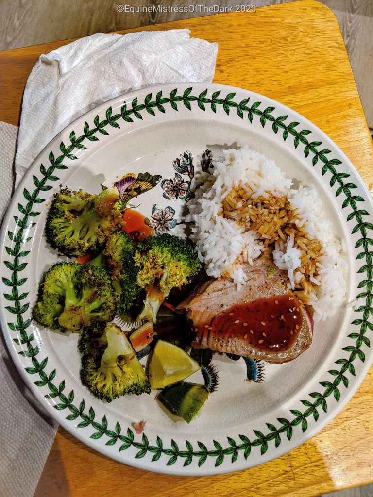 I cooked one of my Home Chef meals for dinner for us. I seriously debated cooking the tuna, since that is my favorite sushi roll. But I ended up cooking it like the instructions said. It turned out good. The broccoli could have been cooked a little longer to be more tender, but the rest of it was good.
