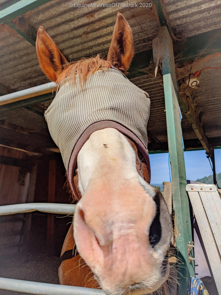 Poppa had taken Lumi into the field for a walk to get him away from my truck. I went inside and said hi to Mom and sat down and had my bagel for breakfast. Poppa and Lumi came back inside and visited with us for a while. Then Poppa and I went outside to paste Gucci, who did really good. We took off his blanket and put on his fly mask, and then we went back inside.