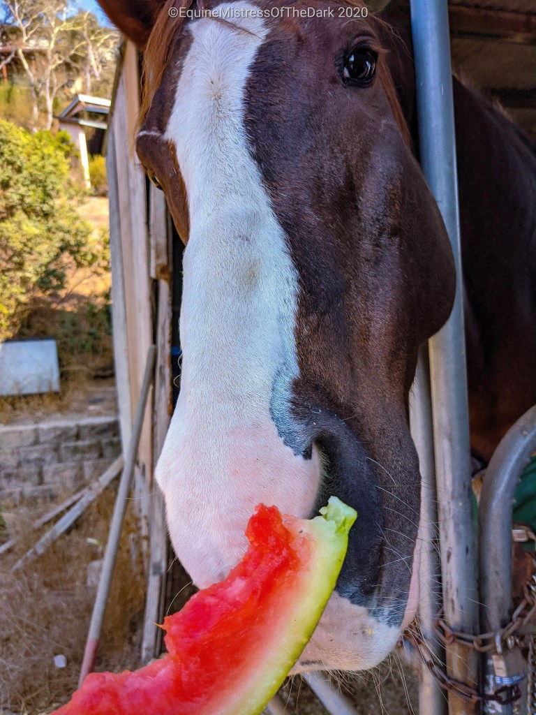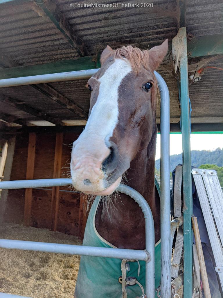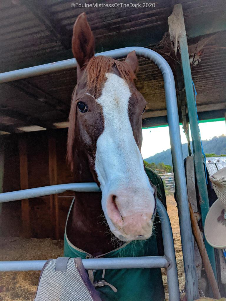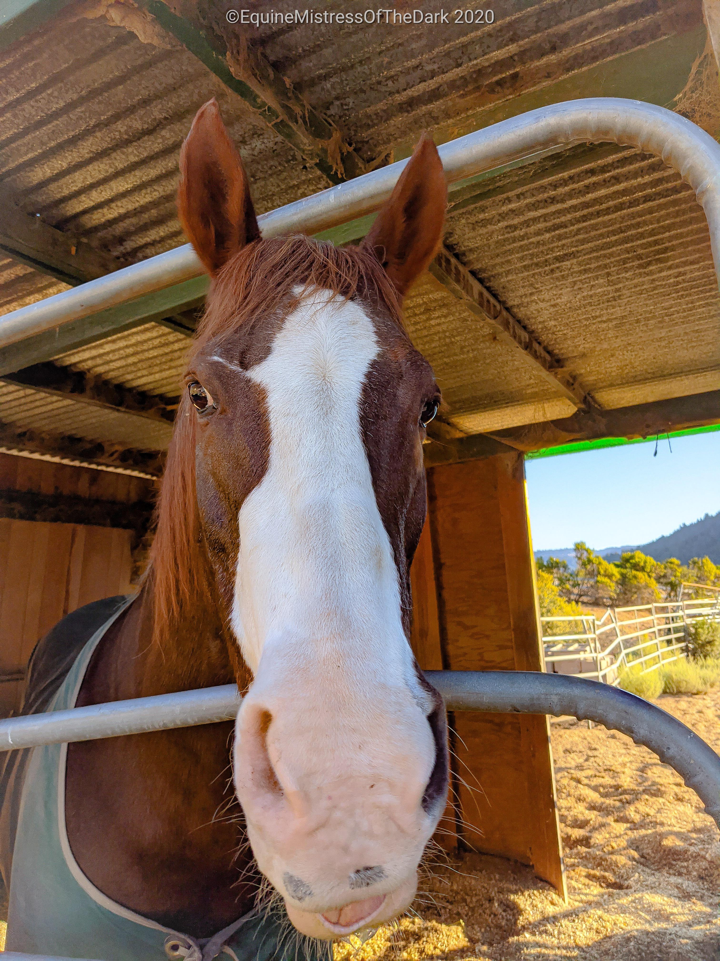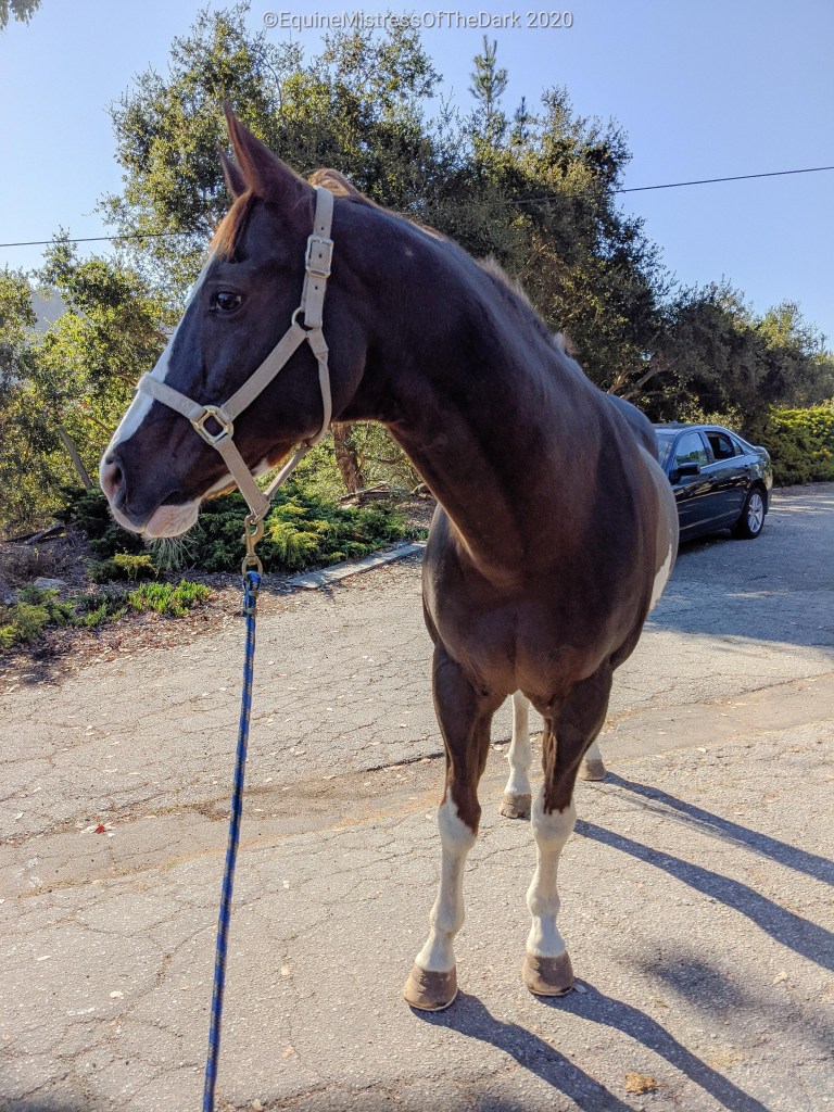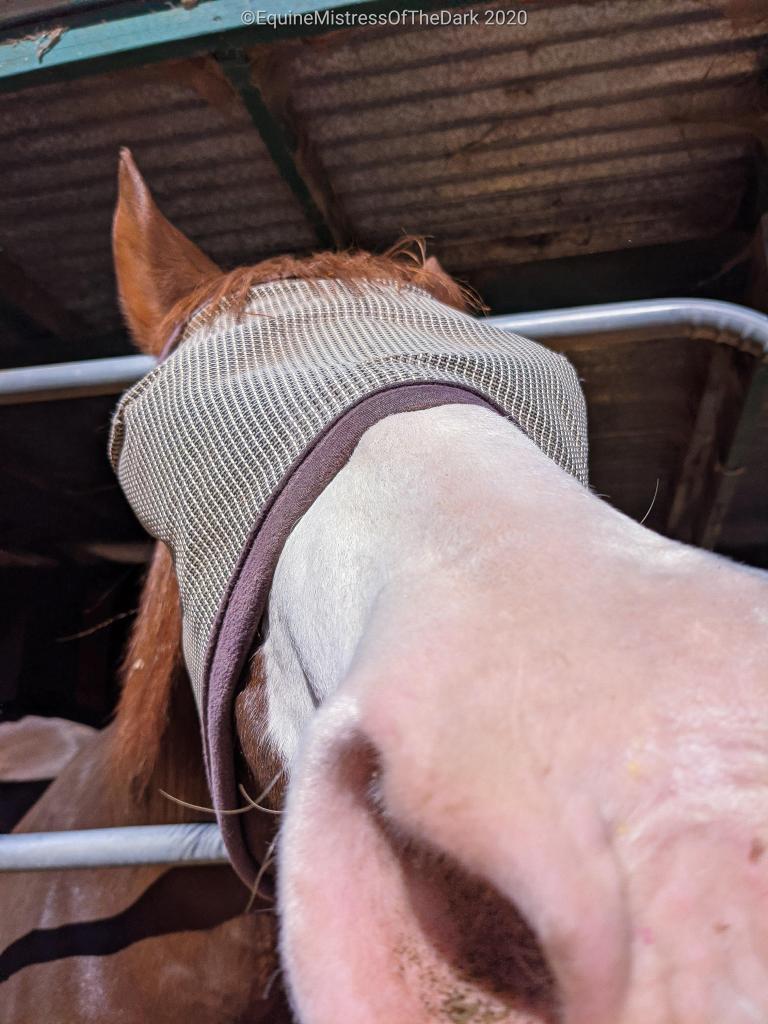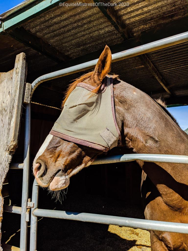I had to tell him to “Stand majestically” for a photo after those duds he gave me over breakfast. We did our laps and he was really good, and then we walked down the field to the ‘mountain’, and he turned into a total stubborn brat. He had to eat at all the dead grass and a new weed I didn’t recognize so I wouldn’t let him eat it. Then he just became more stubborn and sighed at me every time I asked him to move forward. I eventually got him back to his stall where I fly sprayed him and put his fly mask on.