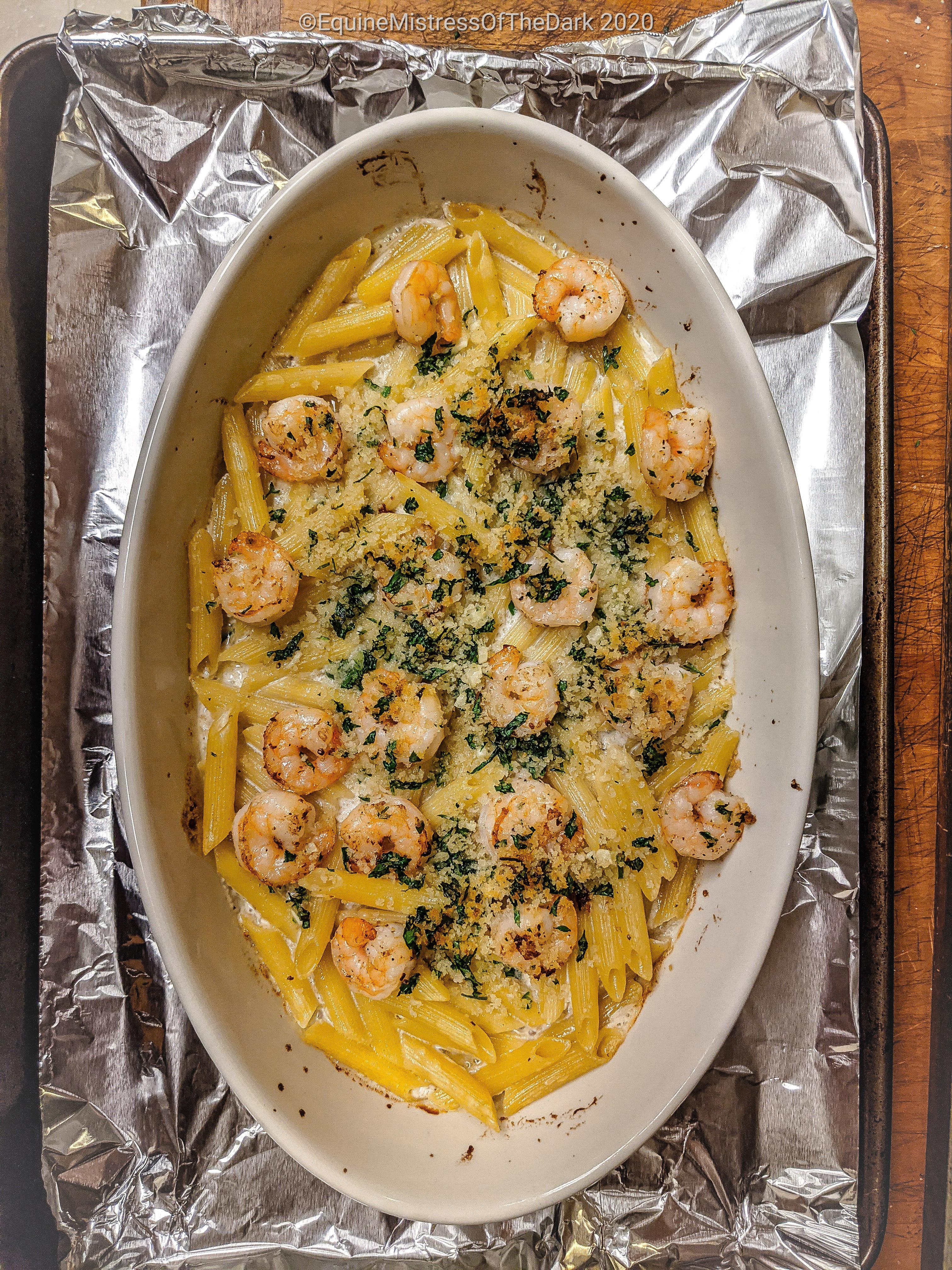 I came home and got cleaned up and then started working on dinner. Shrimp Penne casserole. I got the pasta cooking and most of the prep done while Fiks was on his was home, and he helped me with the shrimp. It turned out really good.