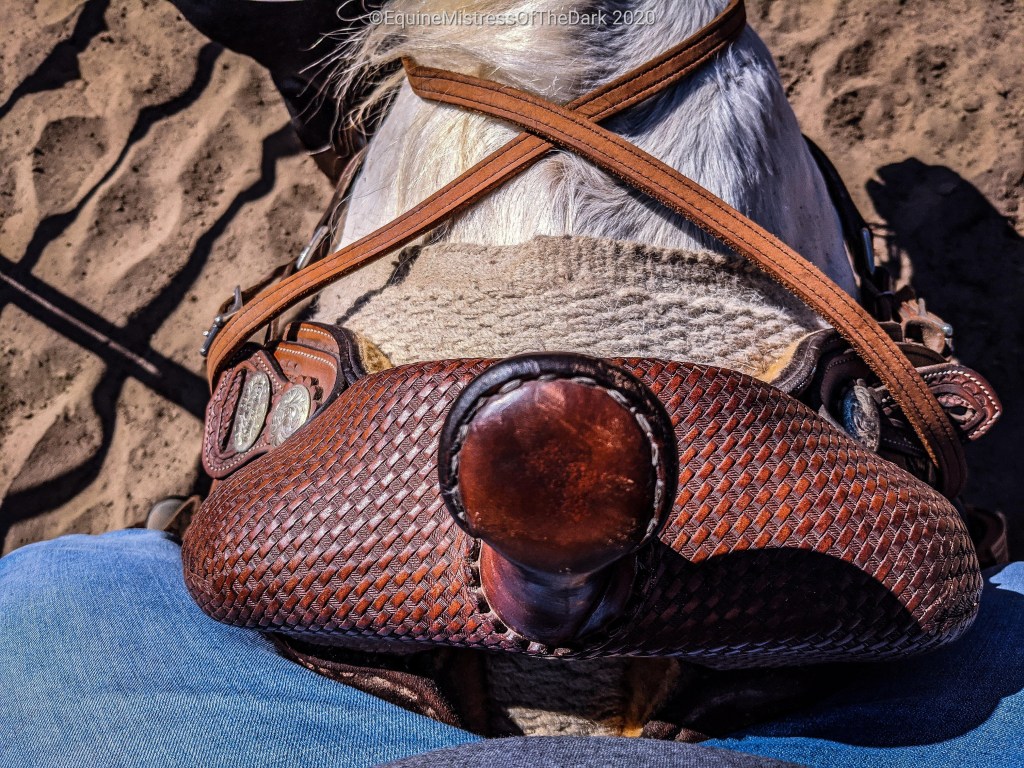 We tacked him up with a western saddle and bridle and then we walked over to the arena. We tightened the cinch/girth and then I got on him. We walked around for a little bit and then we started trotting. My posting made him want to canter, so I just sat his trot and we worked on his woah and backing up. Which is what Other Mother wants him to do. We did some stretches and moved around and trotted. Then we were done and I let him cool out for a couple of laps.