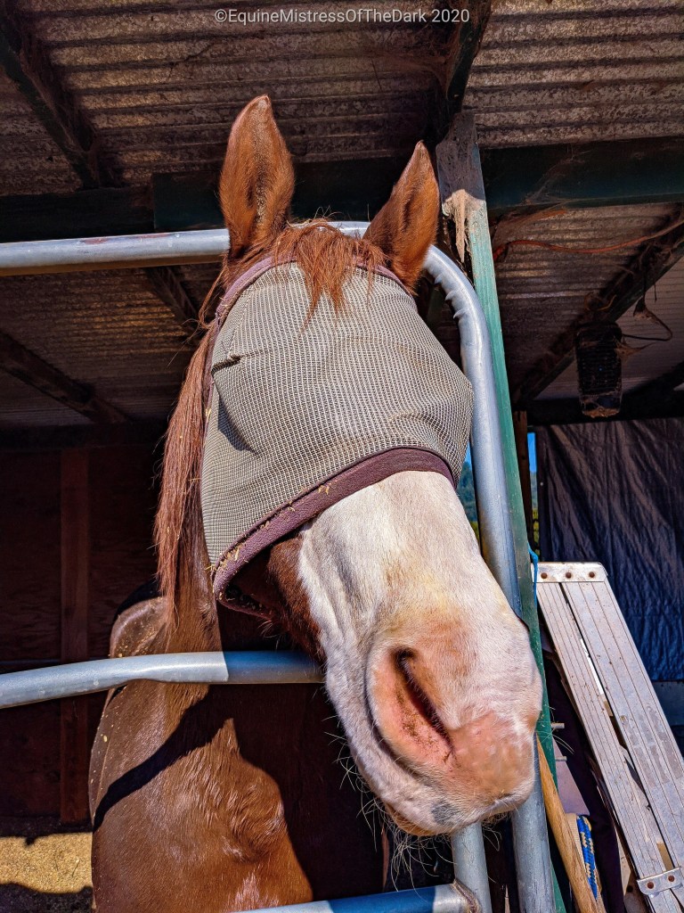 Mom came down and we watched the news for a little bit, then Lumi came bouncing in and said hi to Mom and I and then he bounced out the door to the back patio, wanting to be played with. After I was done with my bagel I went and made up Gucci’s medicine. Poppa went out with me and we pulled him out of his stall and put medicine in his hoof and then we pasted him.