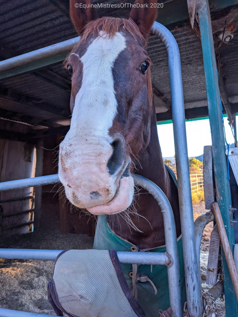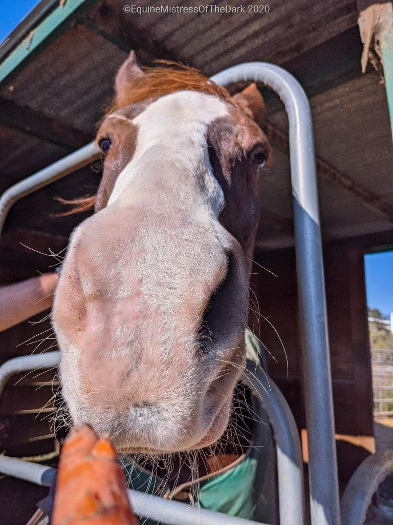 I got up and went outside, armed with carrots, and went over and took off his blanket and threw on his halter and took him for his walk. He was silly, snorting at a water trough he walked by yesterday without a problem. Then he was snorting at the gates at the back end of the house, just being silly. I was asking him if he wanted to go for another lap when he grabbed onto my pants and my cell phone and lifted the carrot out that I had forgotten about. My cell phone survived thankfully. I fly sprayed him and out on his mask and then I went inside. Poppa and I pasted Gucci after a little while, then I got my stuff and came home.