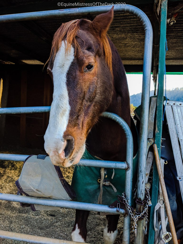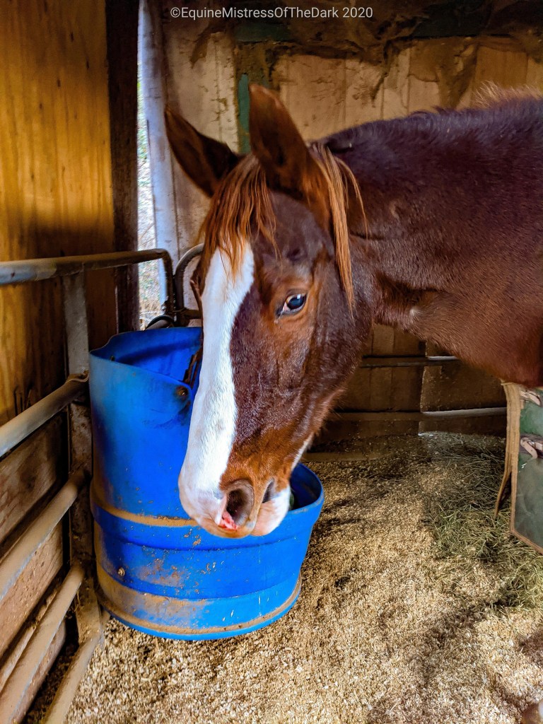 This is when I noticed the nose bleed. It wasn’t bad, and it wasn’t still running. So he just must have sneezed too hard this morning. I kept petting him while he was eating breakfast until Poppa was done mucking out his stall and then Poppa and I went and said hi to Lumi. I petted him then I went to the truck and grabbed my cold bag and the 25lb bag of carrots I had and took them inside. Mom was up watching the news already, so that was a bit of a surprise.