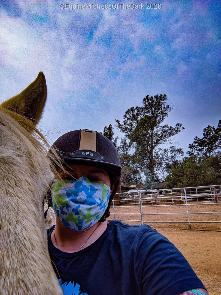 When we were done we dismounted and headed back to the trailer. Smoke and Mora were both looking for treats, but Other Mother doesn’t like it when Mora gets a treat out of hand for some reason. So I threw the 2 cookies for Mora in her bucket as Smoke and I walked by on the way back to his stall. I gave Smoke one on the way and then I gave him his second one when he got into his stall and took his halter off.