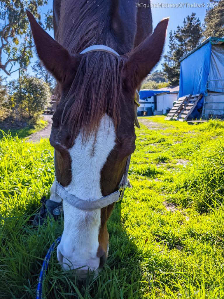 Gucci did fine grazing, really enjoyed himself it seemed. We turned around and started making our way to the gate and his stall. After he was in I gave him his dinner bucket and hay and then we went back inside.