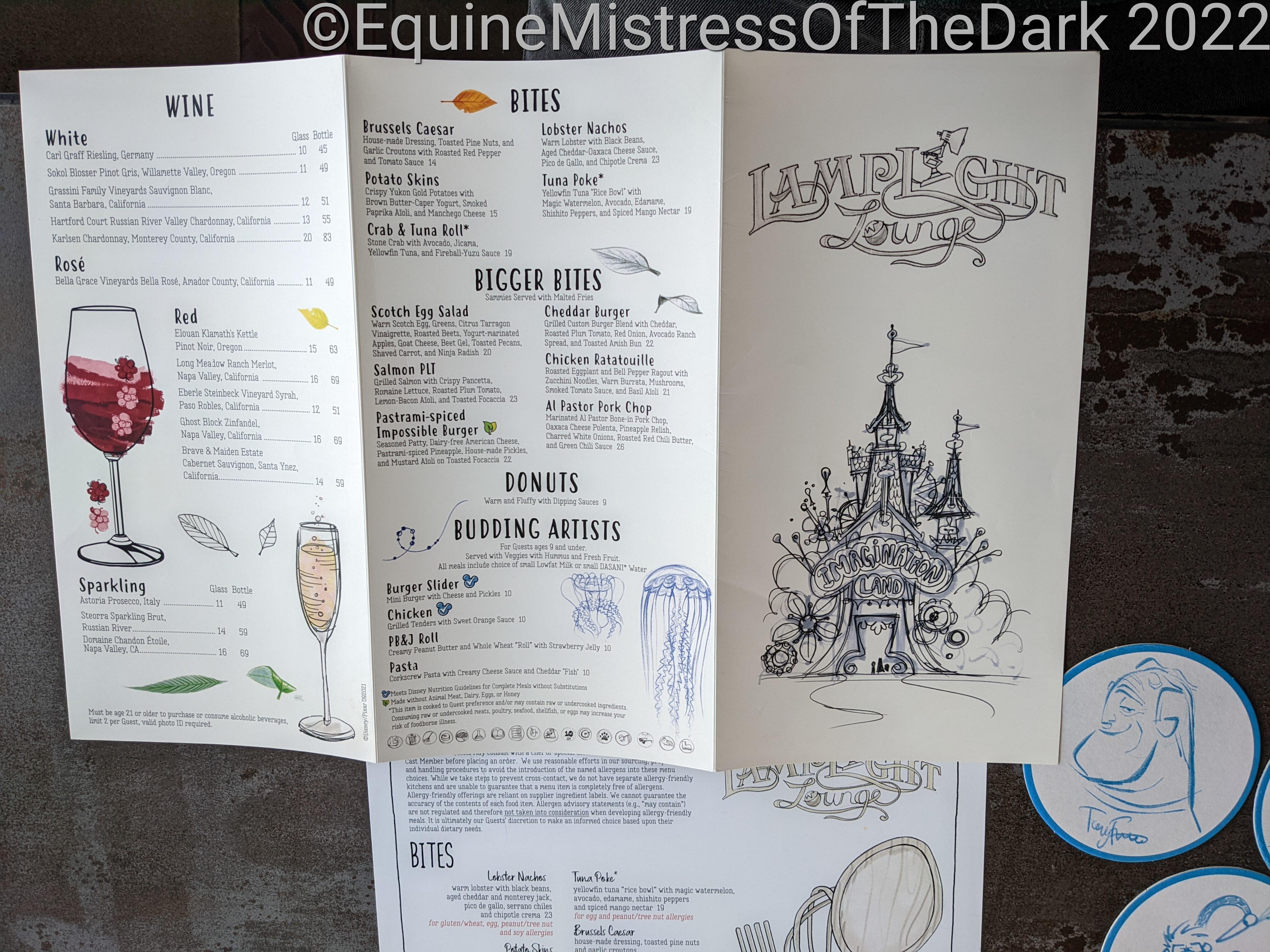 After that we made our way back to Pixar Pier and jumped on The Little Mermaid ride to get off our feet for a few minutes. It was a cute quick ride. Then we waddled around the pier, stopping at our late lunch restaurant, Lamplight Lounge. We ordered drinks and a small appetizer of potatoe skins. It was pretty good, tho the center of one of the skins was cold.