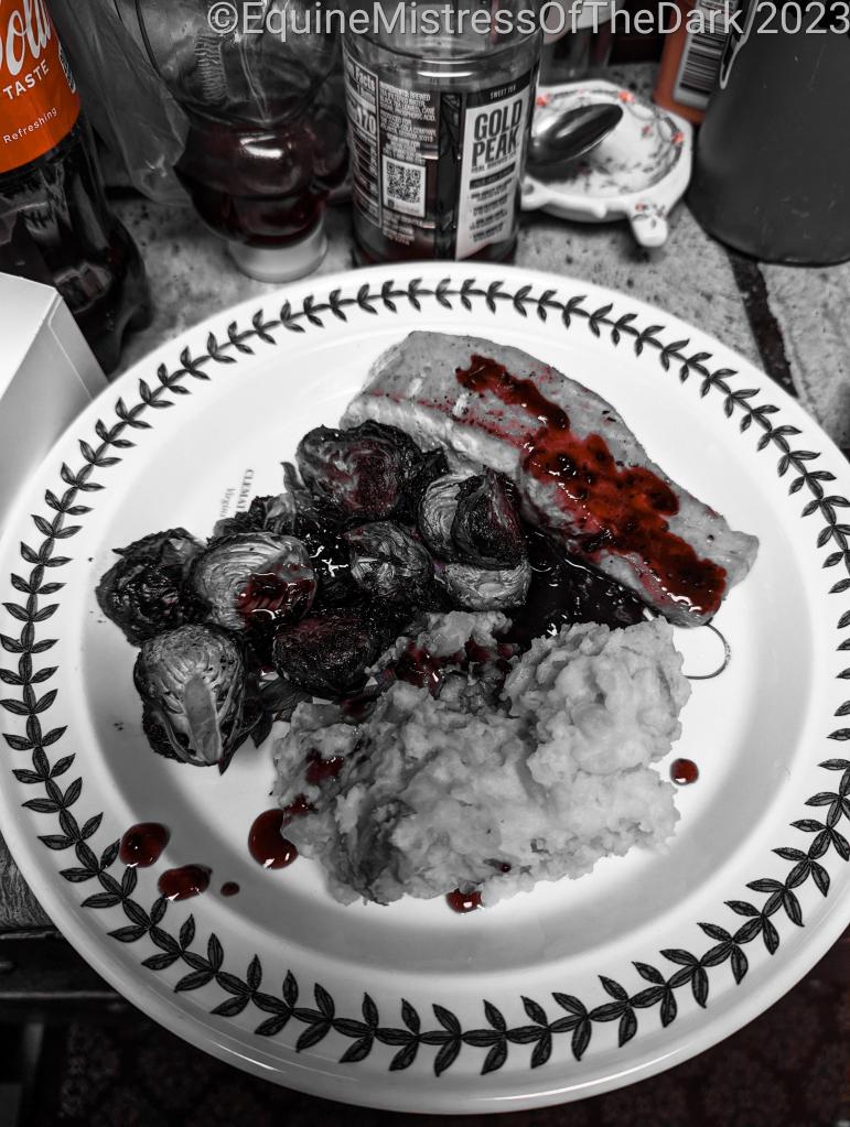 So once the oven was ready I went and started cooking, I got out and cut the potatoes and put them in a pot of water to boil. I cut the brussel sprouts and threw them in the oven, then I cooked the salmon. It all turned out pretty well, even if I could have mashed the taters better. I showed this picture to Fiks and he said it looked like it was a crime scene picture, which made me laugh so hard, so I wanted to put it here.