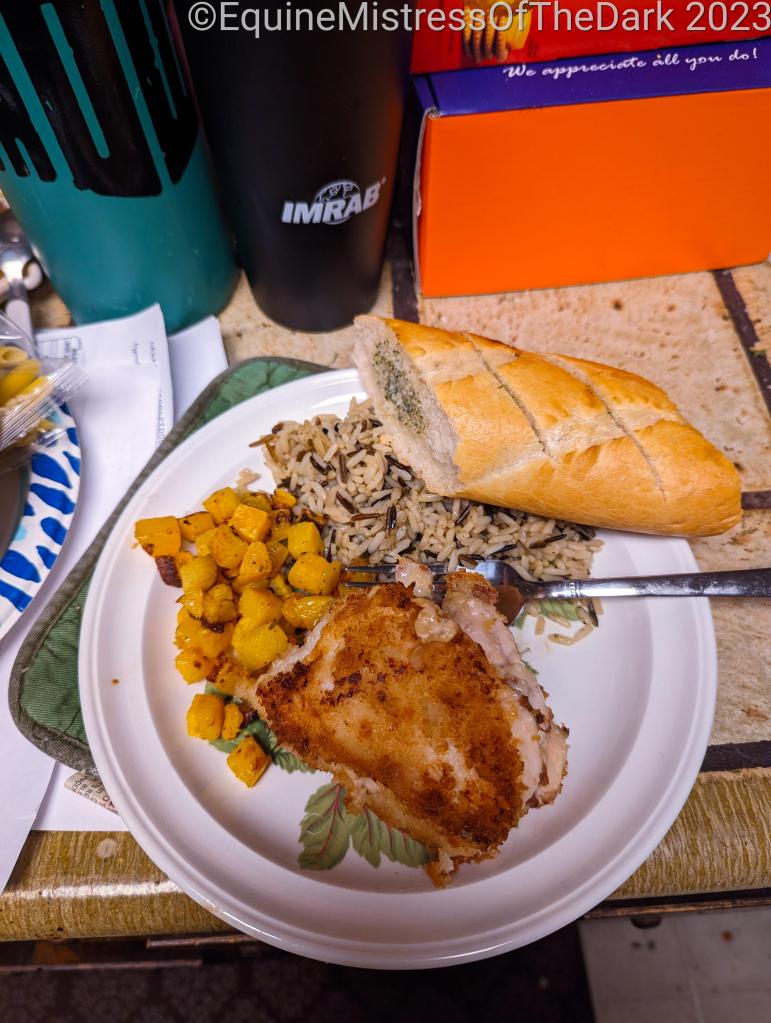 When work was done I came home and divested myself of my knife and pens and name tag and walked over to my Sisters and said hi to my parents. They were doing good. I talked with them a little while before making my way home with my meal box. I set it down on the stairs to the kitchen and took a shower. I then gorged myself on junk food for a while, while watching TV. I got properly hungry and started makin dinner. Chicken cordon-blue with wild rice and butternut squash, yummy.
