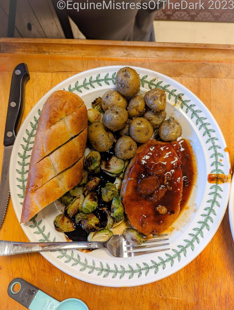 I came home and looked in on my Parents before taking a shower and making dinner. Pork with a peach glaze sauce reduction, potatoes, Brussel sprouts and garlic bed. Fiks came home when I was almost done cooking, so the timing was perfect. We watched more of Good Omens 2, then we watched some YouTube before I went to bed.