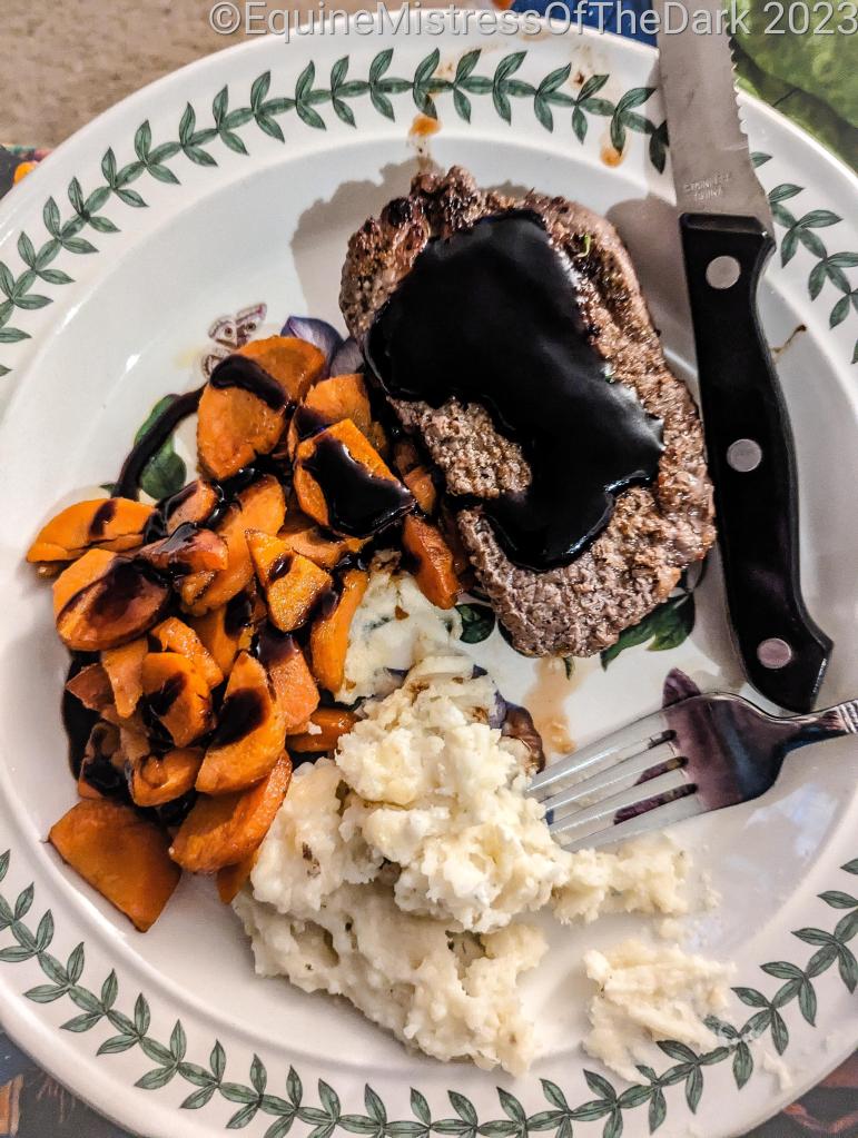 I then took a shower and got changed and started working on dinner. I was going to do the chicken dish, I chopped the broccoli and put the oil in the pans and started warming them up. Then I opened the chicken and boy, did it smell bad. So I threw it away and started the steak dish. That was fine. Turned out really good even though I did mess up at the end by putting the butter and cheese into the potatoes instead of on top of the steak. Whoops. Fiks came home while I was cooking and jumped onto his computer while I watched some more Archer. The steaks turned out really good.