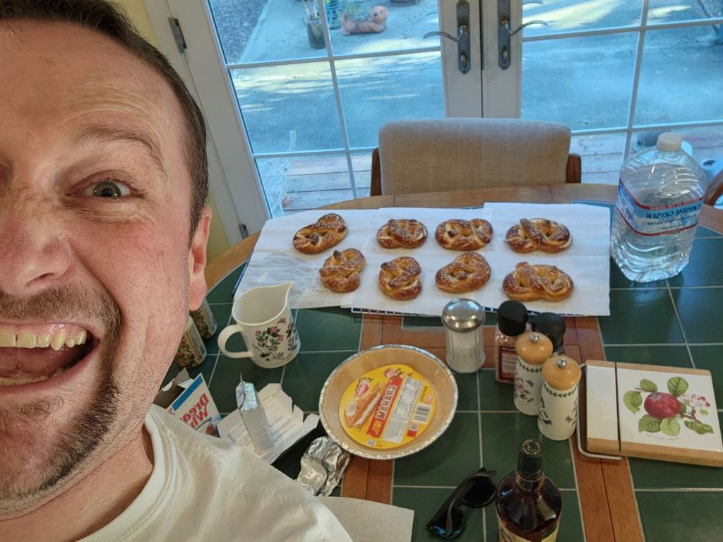 ❤ my some Doctor Who. David Tennant and Sylvester McCoy have to be my favorite Doctors. Thanks again to Fiks who re-introduced me to the show when we started dating. I went and woke Fiks up around 11, and he got up and out of bed and dressed while I was straightening my hair. I threw on a dress and had Fiks zip me up and then we went and hung out in the living room and Fiks ate his cinnamon roll. I tried to talk him into the second one but he didn’t have any interest. When it was time we all got up and going over to my parents house after I made sure I (thought) had everything. We figured out almost at 100 that we forgot a few things for Fiks’ Pretzels. But my parents had enough of the tools for him to make them.