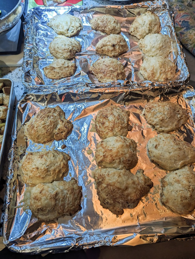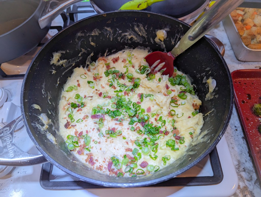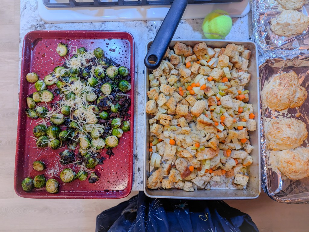 While Fiks was finishing up his pretzels I started working on dinner and basically only stopped for a video chat with my Cousin. And even then I was still running back and forth to the kitchen. The family chatted with her for about 10 minutes before she needed to go to bed because it was midnight her time. Oh, my Sister, who said she was going to help, showed up at 4. There wasn’t much left to do besides make the biscuits at that point so she just sat around and complained that we were going to be eating during the 49ers game at the rate I was going. Whatever. Here’s the spread Fiks, D, and I made for everyone, minus the turkey I realize from uploading the photos for this.